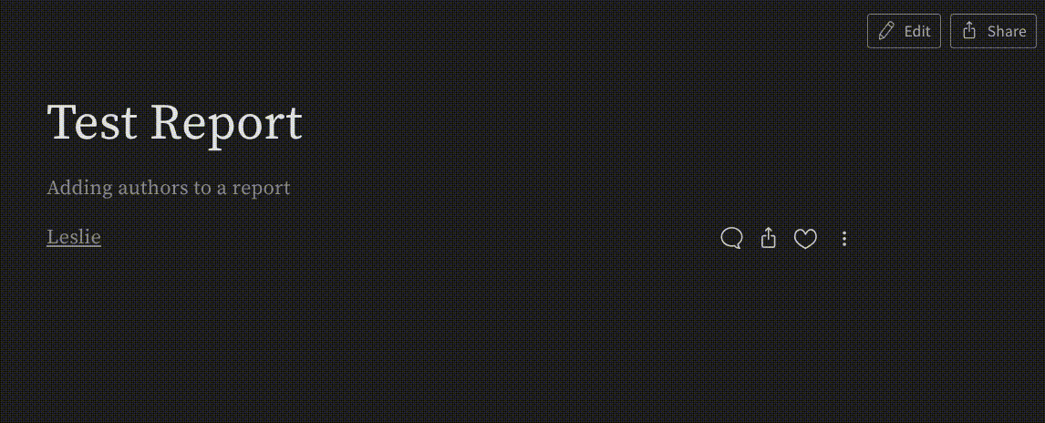 複数のユーザーが一緒にレポートを作成する場合、それぞれのユーザーがクレジットされるべきです。私たちのレポートでは、共同作業したすべてのユーザーを著者行に追加できます。これは、ページの右上の「Edit」をクリックして行います。そこから、著者行の右にある「+」をクリックし、レポートに貢献したすべてのチームメンバーを追加します。